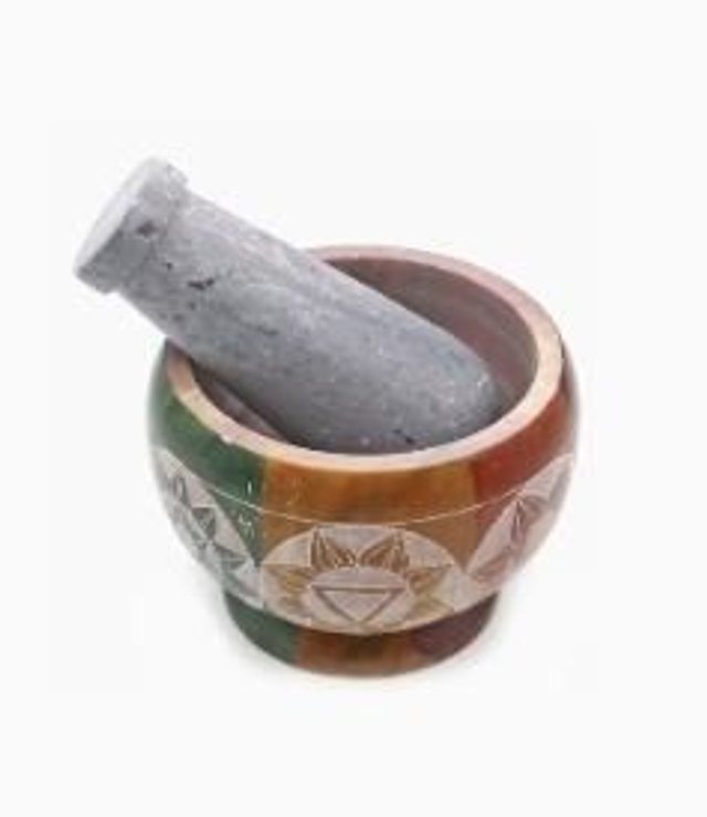 7,5 cm x 9,5 cm. Vuolukivimorsetti & survin, monivärinen 7 chakraa